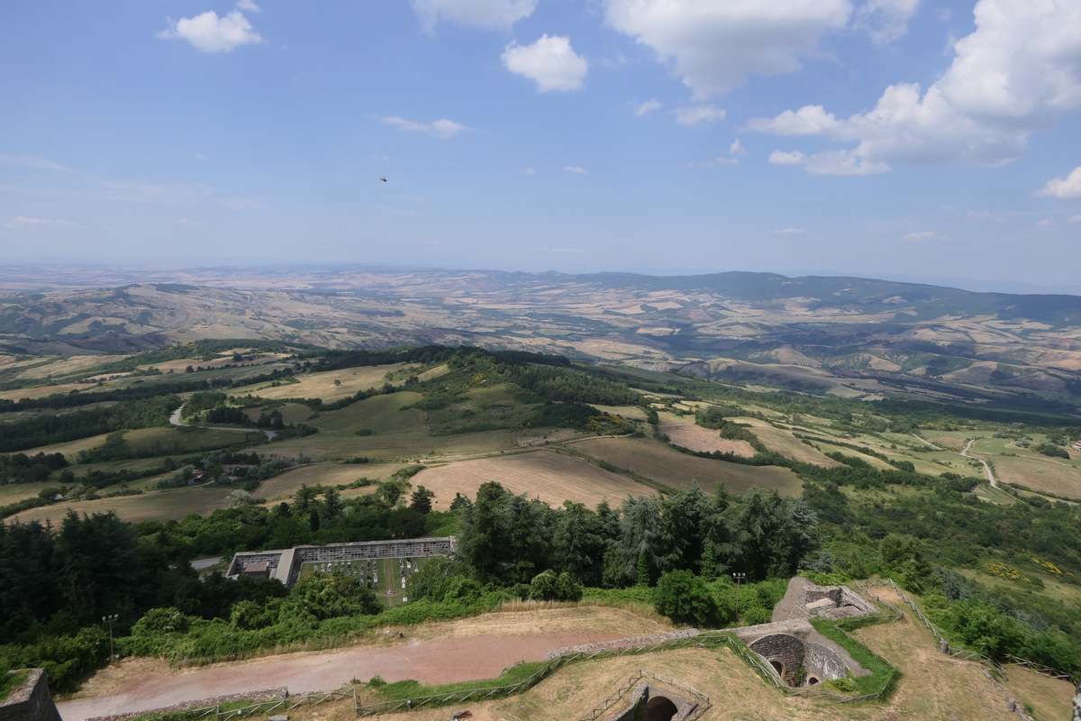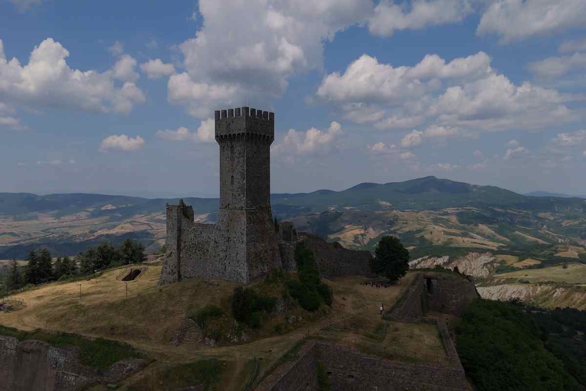 Radicofani is a hilltop town in Tuscany, Italy, famous for its striking medieval fortress, the Rocca di Radicofani, which dominates the Val d'Orcia landscape. This imposing structure, originally Etruscan, was significantly fortified in the 14th century by the adventurer Ghino di Tacco. The town itself is characterized by ancient stone houses and narrow streets. Key attractions include the Church of San Pietro, which houses an exquisite glazed terracotta tabernacle by Della Robbia, and the town museum. Radicofani is a gateway to beautiful natural parks and is renowned for its excellent local wine and cuisine, offering visitors a quintessential Tuscan experience steeped in history and scenic beauty.
